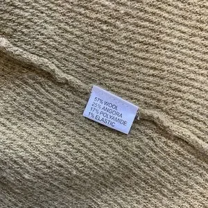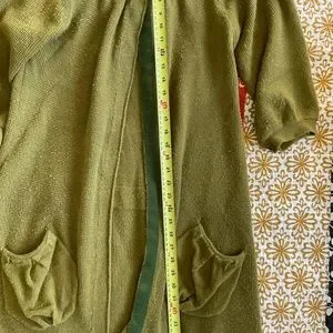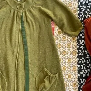 Moss green Laurie b. cardigan with darker green ribbon accent down left side opening. Has large green button with snap back at the collar. 3/4 sleeves end in cuffs with smaller button. 2 pouchy shaped pockets for your phone and what nots. Is a wool angora mix, so has fuzzy pilling.