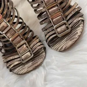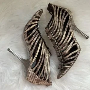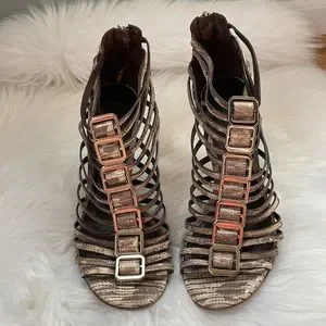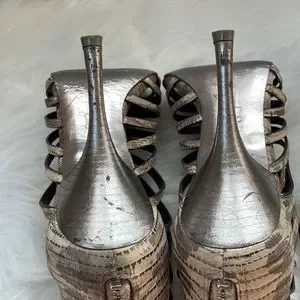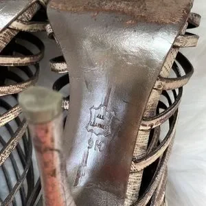 These snakeskin like print gladiator heels, have an open toe and strappy design. Silver tone chain links up the foot bed. A silver metallic heel measures approximately 3 inches. Zippered back. Worn a handful of times and you can see the scratches on the heel themselves. Hardly noticeable when worn. The rest of the shoe is an excellent condition. These are some of my favorites, but I cannot wear this height of a heel any longer.