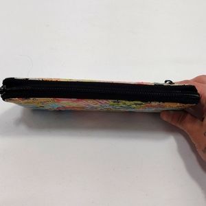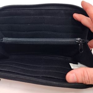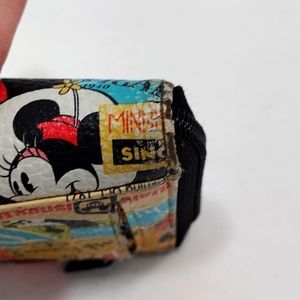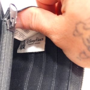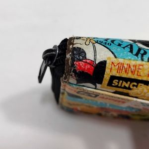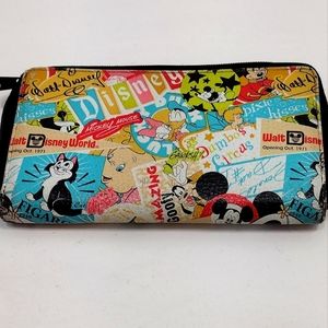 GUC Multicolored faux leather grain Disney wallet with a zipper closure. There is an accordion style exterior "reach-in" pocket. The inside has a black lining. There are 2 accordion billfold pockets. Each billfold pocket has 6 card slots for a total of 12 card slots. There is also an inner zippered pocket.