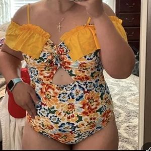 Adorable floral one-piece swimsuit with yellow ruffles and cute small keyhole cutout below chest😍!! New, only tried on. I'd say it fits 18/20. New, only tried on.
