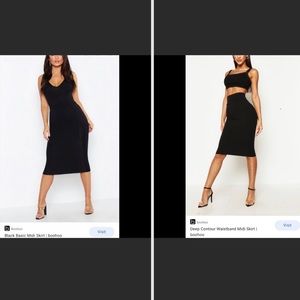 Two NWT black midi skirts from the brand BooHoo. Both are US 4 or U.K. 8. Bodycon fit. One is described as deep contour waistband midi skirt and the other is described as black basic midi skirt by BooHoo.