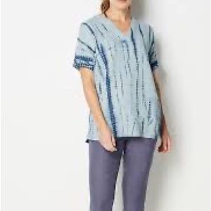 Relaxed pullover tunic made from 100% double gauze cotton, naturally soft & breathable on warmer days. V Neck, cuff short sleeves, side vents. Can be worn tucked in or out. Color is Blue Shadow Multi. Size XL. Brand new!