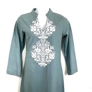 NOWT Maxi dress size XL. An incredible 55 inches (approximately) long! Unique shirt tail hem with splits on both sides. Long sleeves and a nice deep V neckline also feature. Elegant, simple lines are classic and the white filigree detail is anything but boring. The color is a soft, pale blue-green. Very unusual! Wear it with sandals for a lunch? SURE! But why not pair it with sneakers for weekend errands? At the beach? Top it off with a cute floppy hat! Make it yours today!