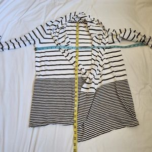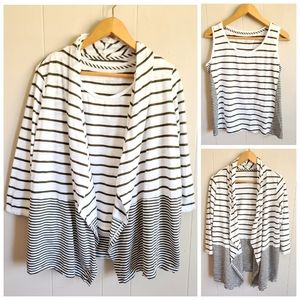 Talbots twin set: open front cardigan with waterfall edge and matching tank top both size S; olive green and white striped stretchy jersey knit; gently used without flaws.