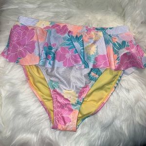 This beautiful pastel, floral, two piece bathing suit ruffles at the straps and the waist. Perfect for summer at the beach, hanging in the pool or just lounging. With beautiful pastel colors and a cheeky bottom, itβs a perfect combination of cute and sexy.