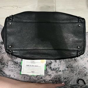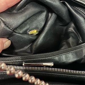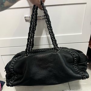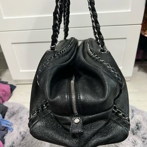 This bag is crafted in black leather with braided leather and silver-tone chain-linked double straps. It features embedded chain trimming around the front and back with the signature CC logo at front.
