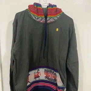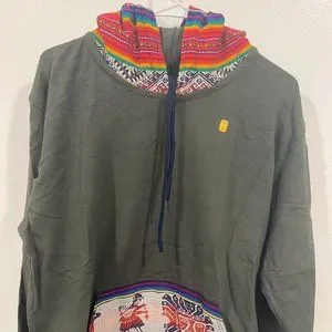 Brand new, never worn Surf Hoodie. Made out of cotton - thick fabric. Beautiful peruvian inka motifs on hoodie and kangaroo pocket. Ideal for surfers or just to hang out, both for men and women. Cotton fabric. Men's size Large. Color: military green