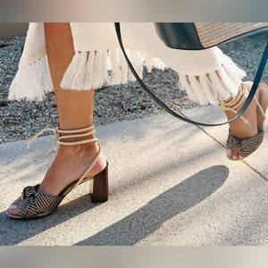 A knotted vamp accent and wraparound ankle strap frame a boho-chic sandal lofted by a stacked block heel with a scultped silhouette.