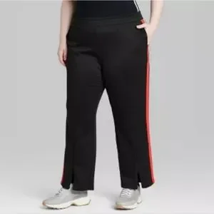 New, solid-color track pants from Wild Fable designed with front center seams with zipped slits at the hem and contrast taping down the sides. Tailored in a high-rise silhouette with regular fit and straight legs. Side pockets and full waistband elastic add functional touches to the pants.
