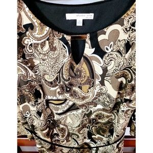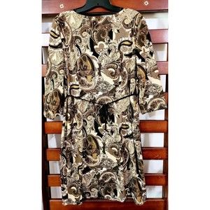 NWOT. Beautiful neutral tone dress with gold adornment at neckline. Black fabric belt.