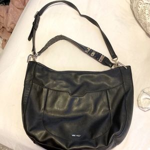 This is a black leather, Nine West purse. It’s super cute and in great condition. It has a shorter strap and a longer strap you can attach and reattach. Both of the straps. It has a pocket on the outside and three pockets on the inside it zips shut