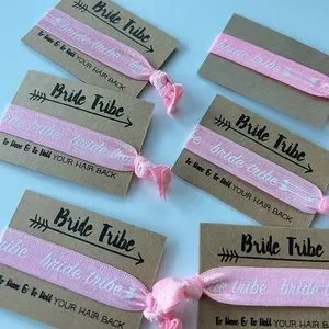 6 bride tribe pink elastic hair ties. One is missing the cardstock that says “bride tribe”