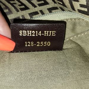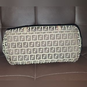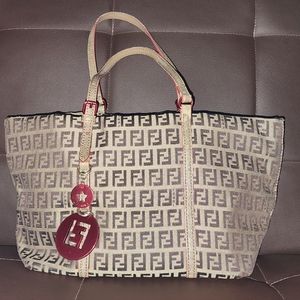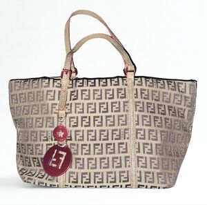 Fendi Brown Zucchino Canvas Tote with leather trim. This beautiful bag comes with a built in charm attached to it. This bag has 1 interior pocket, double flat leather handles, zip closure, gold-tone hardware & fine textile lining.