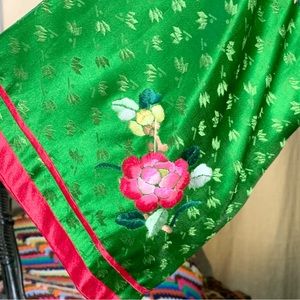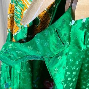 Gorgeous 40s 50s vintage embroidered China silk pajamas, lounge set or hostess set. Bright green patterned silk, hand embroidered florals and dragons, contrast red piping trim and frog closures. Adjustable high waist pants have button sides