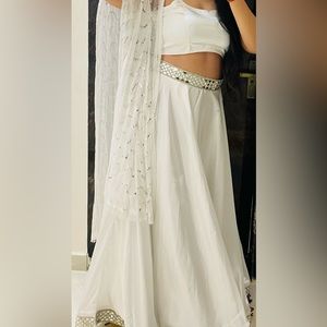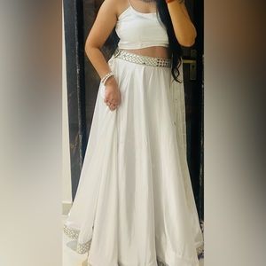 White lehenga made of luxurious satin with a voluminous skirt, spaghetti blouse, and a white net dupatta with sitara work.