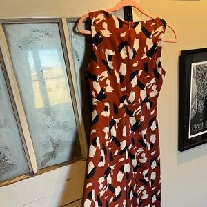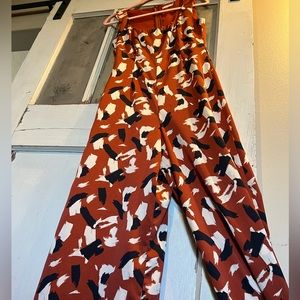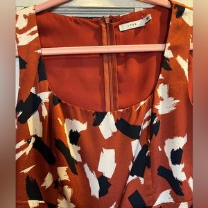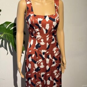 This sleek pantsuit has an easy wrinkle free satin feel that gives you boss vibes at work & transitions effortlessly to cocktail hour. This classy satin feeling tank style jumpsuit is a beautiful orangey rust color with swipes of navy and cream barely worn zips up the back excellent condition, no smoking. No snags, other than the peeps you gonna get wearing this gem.