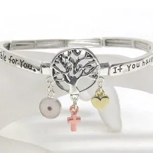 Life of tree message stretch bracelet - if you have faith as small as a mustard seed nothing will be impossible for you. Mustard seed charm, rose gold cross and heart of gold charm. Size: 1 1/2 inch x 1 1/4 inch stretch. Brand new and gift boxed.