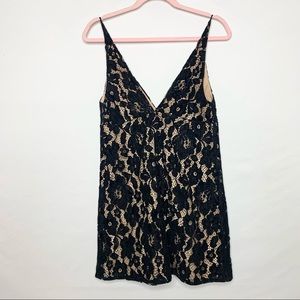 Delicate floral lace graces a flirtatious A-line dress designed with a thigh-grazing hemline and a plunging V-cut back