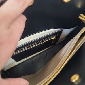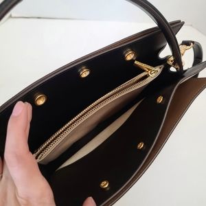 5 interior compartments (1 center zipper compartment, 4 open compartments), 1 side wall zipper pocket, 1 side wall slit pocket