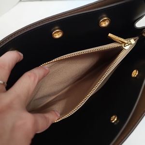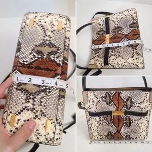 "The Lee Radziwill Double Bag contrasts structure and softness, mixed materials, different colors. Composed of layers that unfold like the collar of a trench coat, it can be worn opened, semi-buttoned or fully closed. Beautifully crafted in snake-embossed Italian leather and suede, with signature lock-and-key hardware. The collection is named for Lee Radziwill, a woman Tory always admired — she was fearlessly unique. "