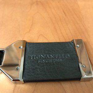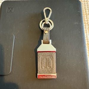 Tignanello; Hangtag with Key Ring and Large Lobster Clasp; Front: Embossed with Logo "T" in Pebbled Leather; Framed in Silvertone Top/Bottom; Brown Pebbled Leather Strap attaches Silvertone Key Ring and Smaller Silvertone Ring w/Lobster Clasp; Back: Embossed with Tignanello Since 1989; Total: 1.5" Across x 6" Up/Down; Price firm unless bundled with other item(s).