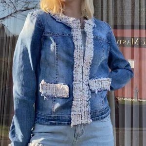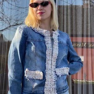 Super Fun Jean Jacket, Embellished With Fun Soft Colored Tweed Material. Size small And Very Comfortable. Eyehook Snaps For Closure.