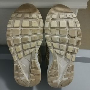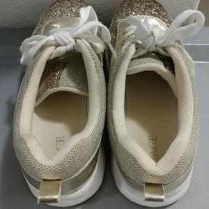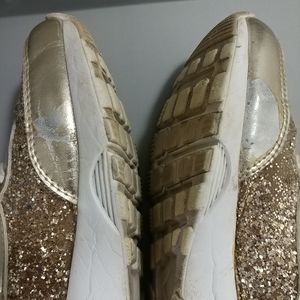 Preowned. The Children's Place Girls Gold Glitter Sneakers Shoes. Girls Youth Size 5. Used & Shows wear. Some spots the material is worn off. Some stains. Please see pictures for details. The shoes are a Gold Color with Gold Glitter. The shoe laces are white.