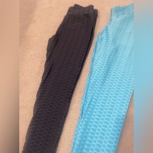 2 pair of Woman’s shape enhancing leggings. Aqua & Dark gray, both only tried on new without tags. Scrunch bum for shaping and stretching material. Size medium on both