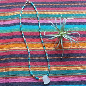 Tag's beach glass necklace, sea glass necklace, beachy, summer jewelry, Beach bum, surfer jewelry, surf and sun, recycled jewelry, boho necklace, hippie necklace, upcycled, recycled jewelry, sustainable, eco chic, Mermaid, Minimalist, Turquoise, simple, beaded, mermaidcore, beachy boho, resort, Turquoise