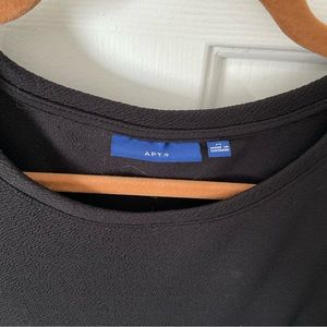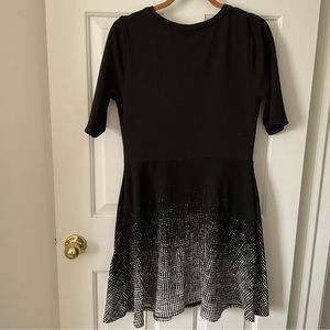 Black dress with white and black geometric pattern at the bottom of the dress. Knee length, short sleeve. Excellent used condition.