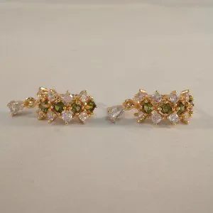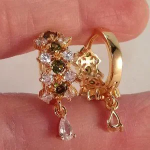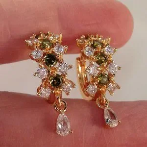 Beautiful chic classic design diamond shape layered zircon hoop huggie dangle earrings 18k yellow gold filled w/sparkling round peridot olive green + white round + pear tear or water drop simulated diamond zircon gemstones. Top quality, high polished shine, brand new, never been worn. Lead, nickel free. These gorgeous earrings sparkle.
