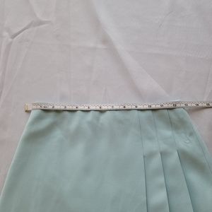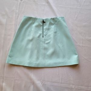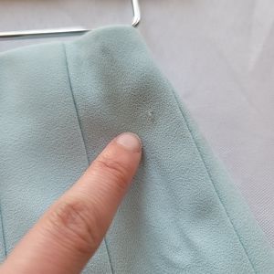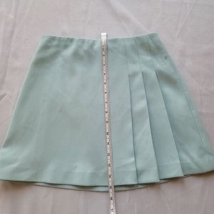 Sky blue mini skirt with pleats on one side. A-line shape, back zip closure, and smooth crepe fabric. New with tags, but has a small pull on the front (see last picture).