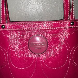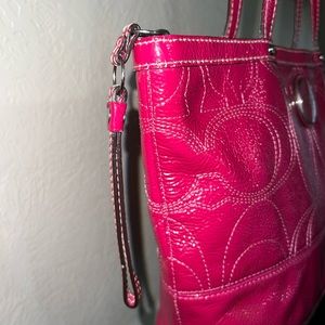 Well loved, but plenty of life left in this gorgeous stitched Coach bag with a pop of pink color. The price is reflective of the inside staining which is completely hidden when carrying the bag. The straps are an 8” drop. The bag itself is approx 10”x14” and approx 3.5” wide on the bottom.