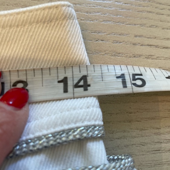Cache Silver chain trimmed white cotton Jeans are in pristine condition size 0. The jeans are lighter weight and NOT like regular denim. They are high-end very designed and sold for a mint price. Someone will steal these! Measurements are taken laying flat and are in pictures. Always taking offers. Always here to ask questions.