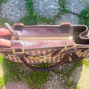 Bag has a beautiful center metal zipper with brown leather side