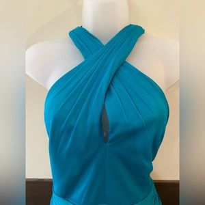 A crisscross neckline and ruched waist teal bridesmaids dress from David’s Bridal. Actual color name is Jade. Great condition , size 12.