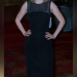 Perfect for your next holiday or New Year’s party! Sleeveless black sheath dress with lace panel that gives your figure a va-va-voom effect! Zipper back and comfortable stretch fit. Lightly worn, great condition. Size 2.