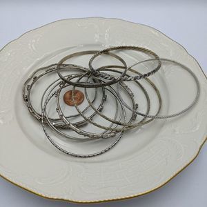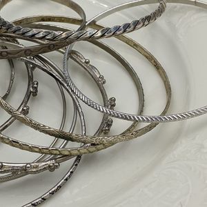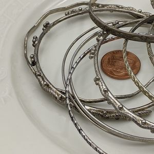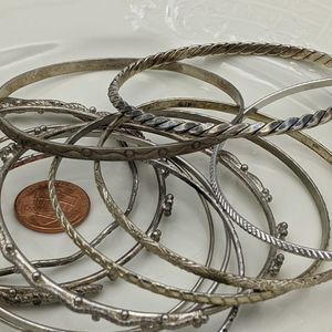 In the bright light some appear to have a gold tone, but to the naked eye they all looked Silver tone to me. To be safe I'll say silver and gold tone bangle bracelets. Minor wear associated with normal use. Please see pictures for details and condition. Measure 2.5". Thanks for looking!