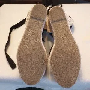 A beautiful black pair of material wedge shoes that tie around the ankles. Immaculate, I tried them on but never wore them. The size is European 36 From a pet free and smoke free home.