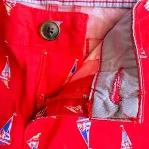Great used condition. Really cute red shorts with sailing boat pattern. Shorts are cuffed. Front pockets with back fake pockets.