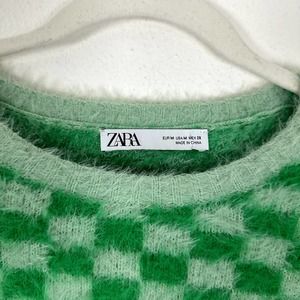 ZARA Green Check Fluffy Knit Crew Neck Cropped Sweater Size Medium