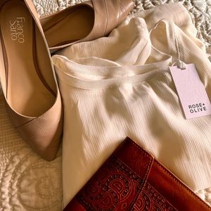 NWT Dreamy cream ivory kimono tunic style blouse from Rose + Olive. Size M has an attached camisole lining. See pictures for details as part of the description. Visit my closet for the India clutch and the Franco Sarto flats. Great casual combination, enjoy!