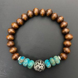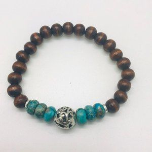 Beaded Bracelet - wood and turquoise with silver accent beads - elastic/slip-on