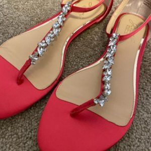Almost new. Worn once inside for pictures. Jewel Badgley Mischka's Gaby Sandals with a stunning T-strap silhouette and sparkling rhinestone accents. Fabric content and colors include: Satin fabric in hot pink Round-toe T-strap ankle-strap dress sandals Adjustable buckle closure at ankle strap Rhinestone embellishment at T-strap Size 8 with 1/4" heel Satin fabric upper; man-made sole Looks great with anything - dress up or wear with jeans - super cute!!!!