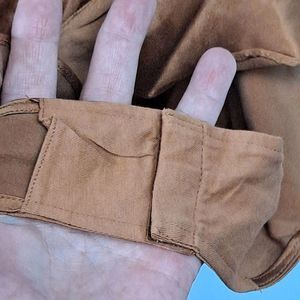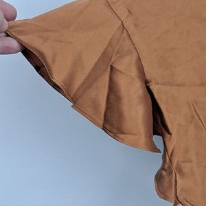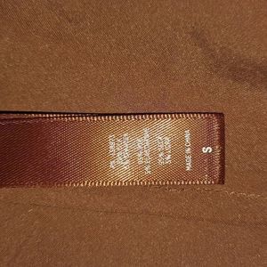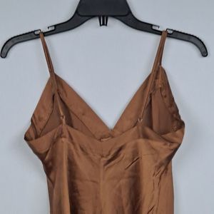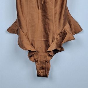 Bronze is the color, size small. V front with keyhole and bow in center, fully adjustable straps. Hi cut bottom with ruffles on leg holes. Double snap crotch. 95% silk, 5% spandex. Beautiful! Retail $118