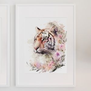 Floral Tiger Watercolor Wall Art Illustration Print Poster Card Unframed