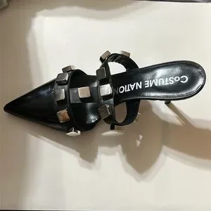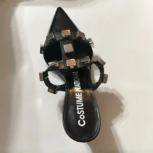 Metal studs accentuate the sleek point-toe silhouette of these versatile stiletto mules. Leather upper. Point toe. Slip-on style. Leather lining. Leather sole. Made in Italy SIZE. Self-covered stiletto heel, 3" (76mm). Costume. National. Color: black