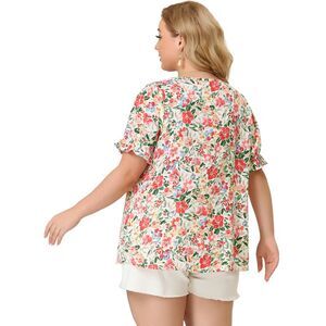 Plus Size Floral V Neck Ruffle Short Sleeve Chic Summer Tops White