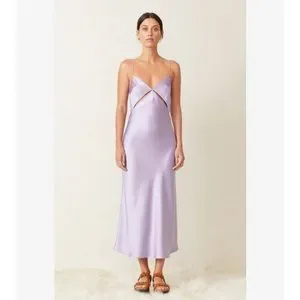 Sleeveless silk midi dress in a lovely lilac purple color. Has cutout details. Fabric is weighty and substantive (which I have found to be uncommon in silky dresses and often frustrates me). Worn twice and it’s sold out! Honestly got so many compliments in it. It’s time for someone else to continue its beautiful life. There are a couple runs towards the bottom back that are not visible when wearing but for full disclosure there’s a picture of them that I uploaded. Invisible zipper in the back with a nice open back section and 2-button closure. It is 100% polyester. Aus size 6, US size 2.