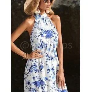 Floral Print Maxi Dress High Neck White Blue Long Flared Halter